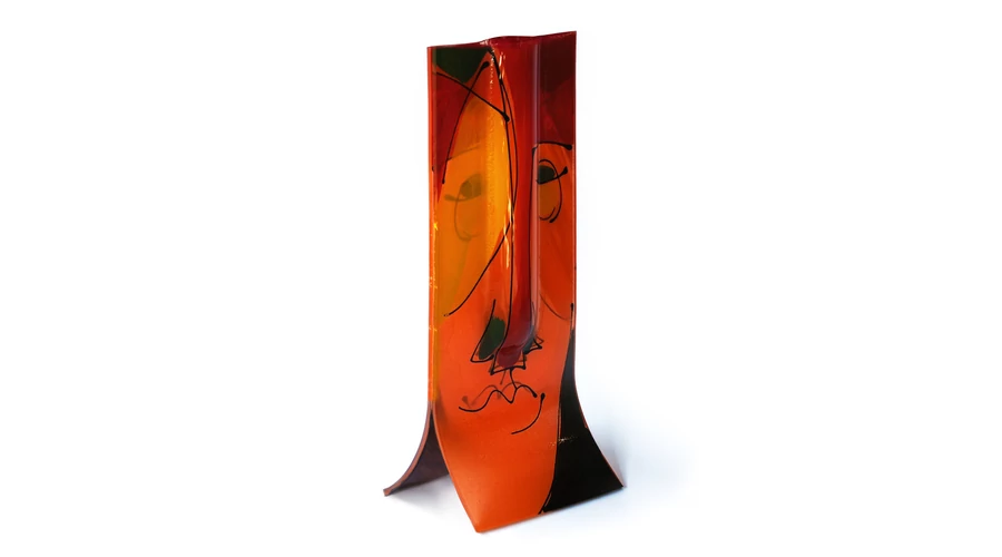 Beégetős technikával készült üvegváza kubista arcot idéző narancs és fekete színállásban, 14x36 cm