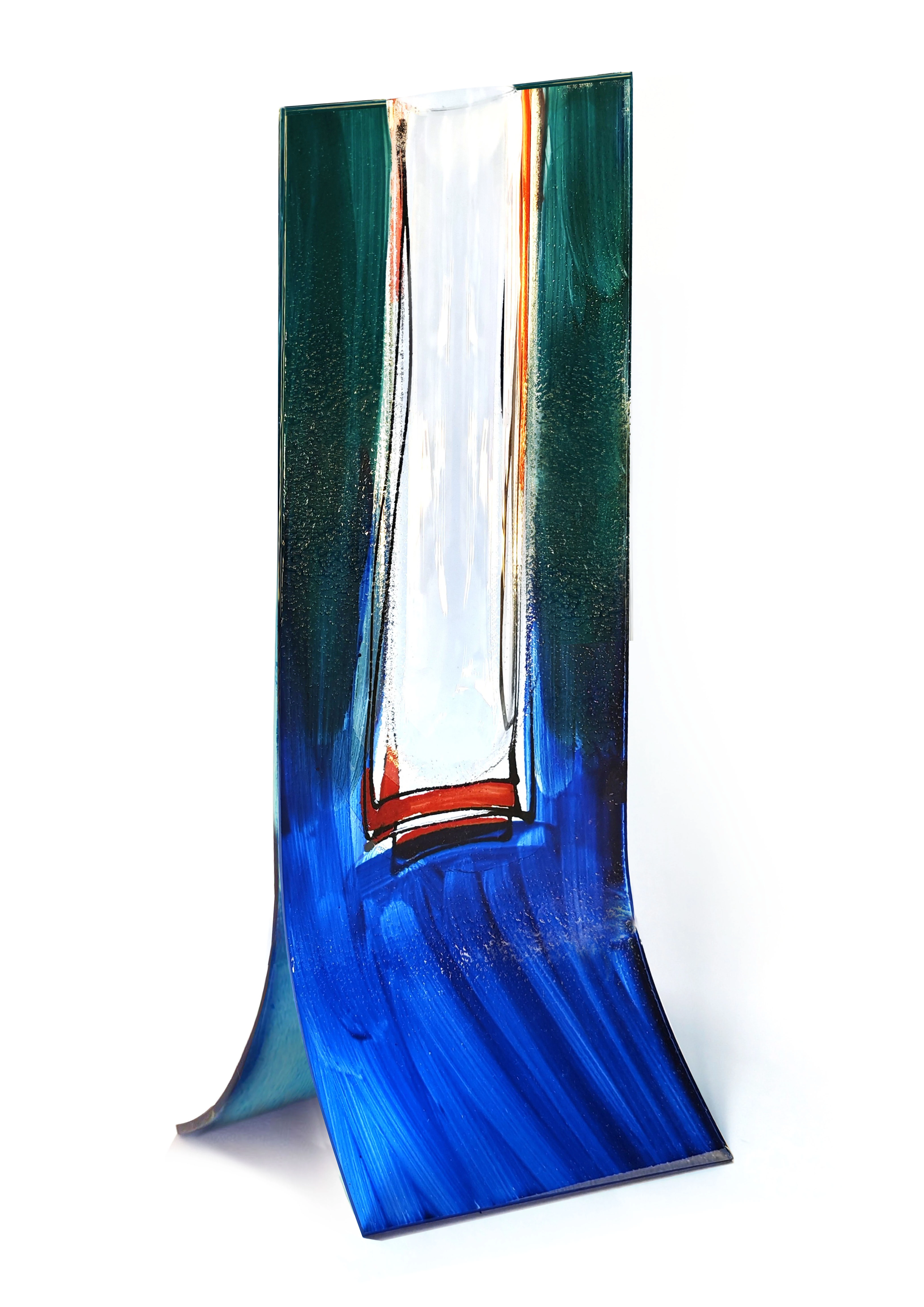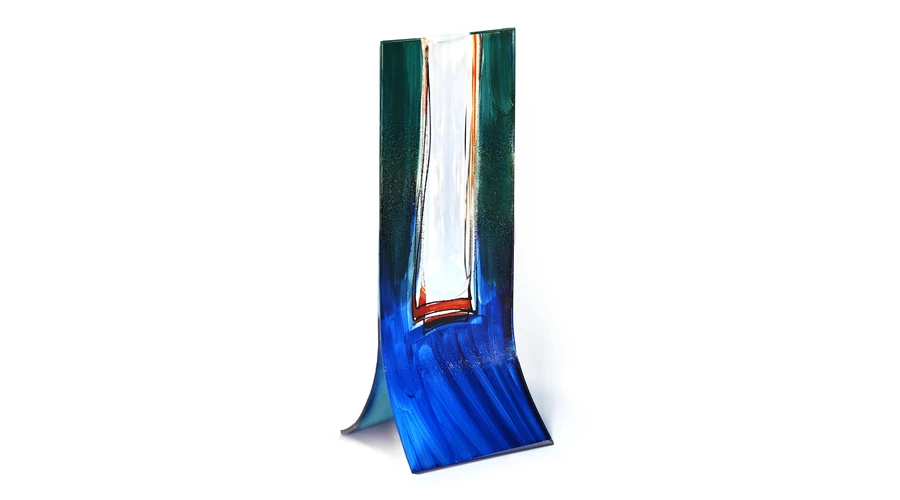 Beégetős technikával készült üvegváza sötétkék-piros, tengelyében transzparens színállásban, 14x36 cm