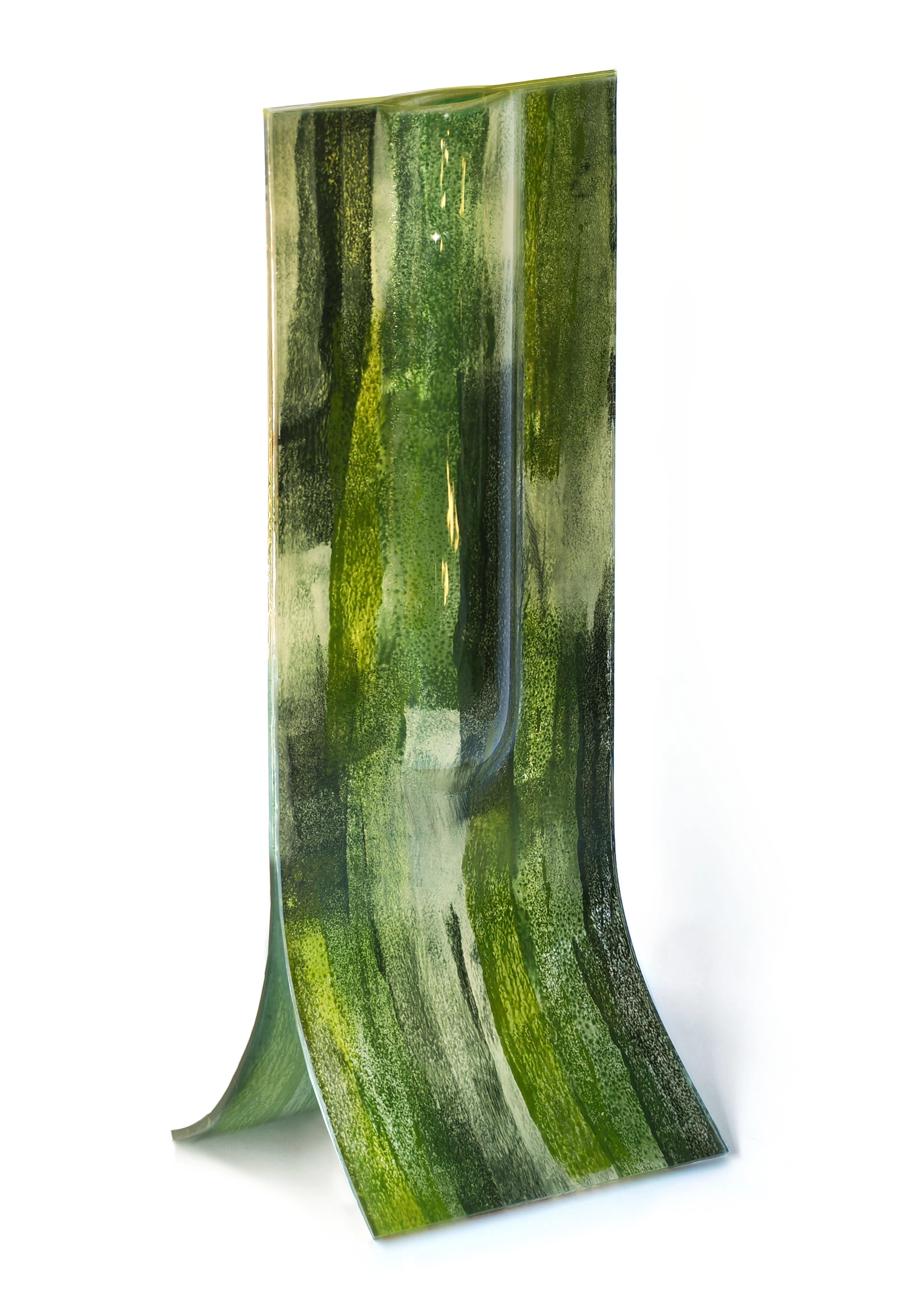 Beégetős technikával készült üvegváza moha és fűzöld színállásban, 14x36 cm