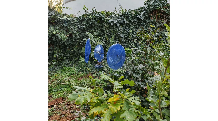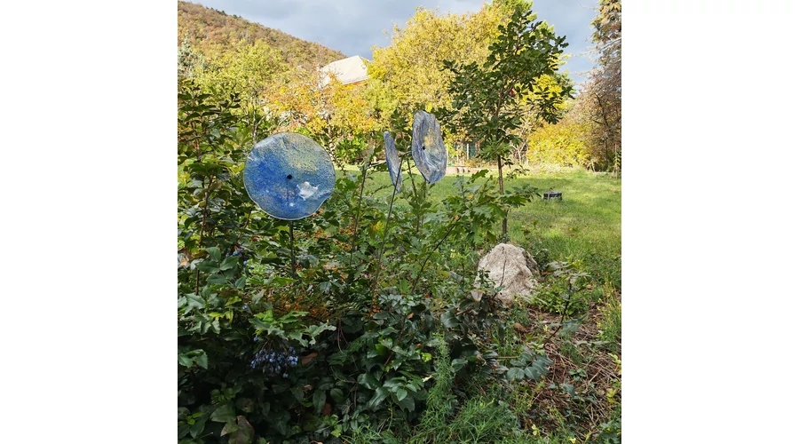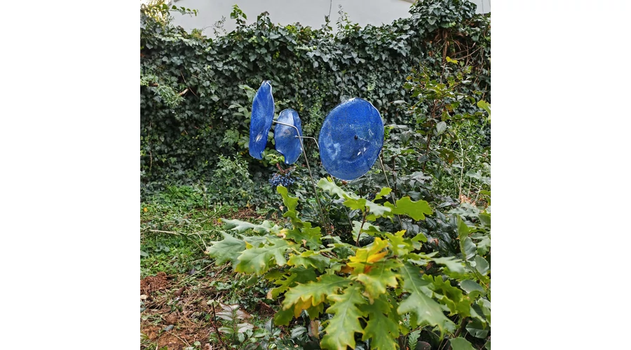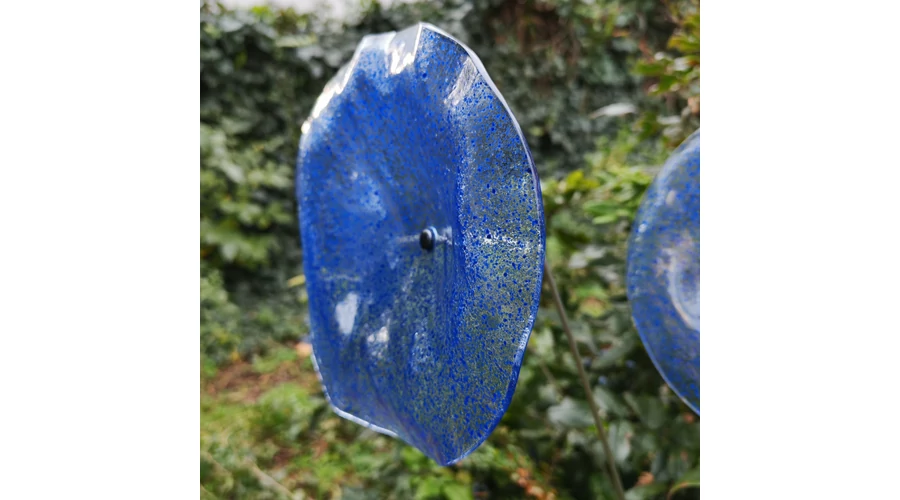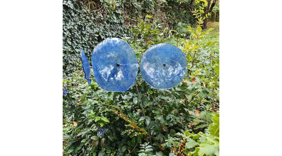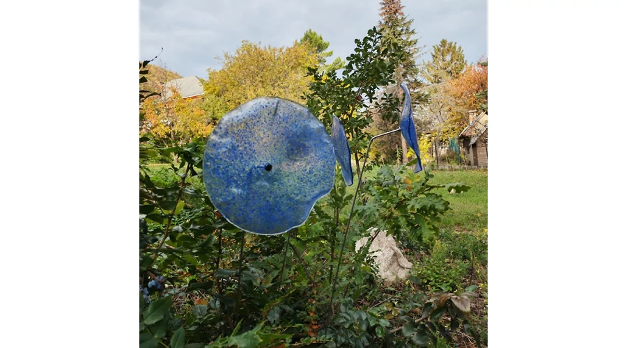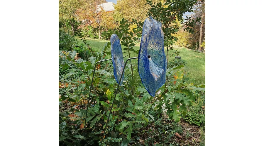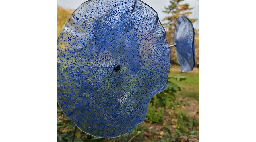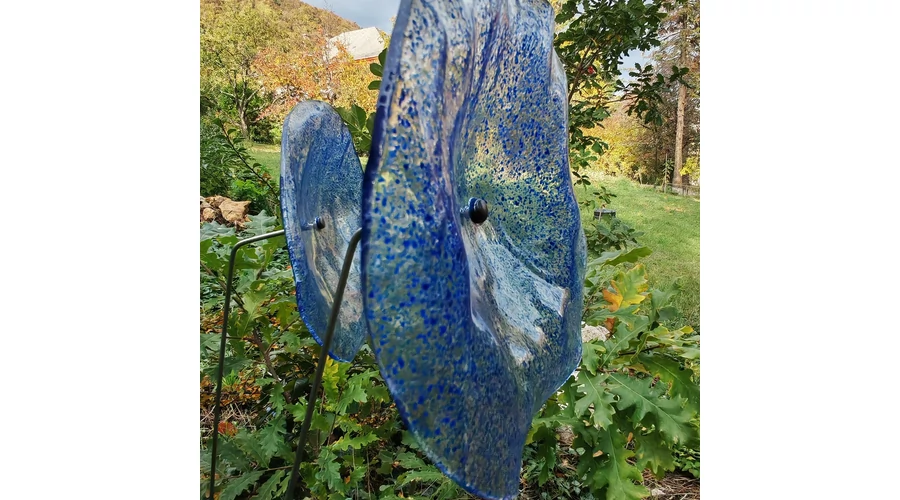 Nagy méretű 18 cm átmérőjű üveg virág kültérre transzparens- sötétkék-világoskék színben 100 cm -es rozsdamentes acélszáron. Vidám és színes virágjaink télen-nyáron színesítik a kertedet vagy az erkélyedet. Harmonizálnak az élő növényekkel és virágokkal. Üvegvirág átmérője: 18 cm