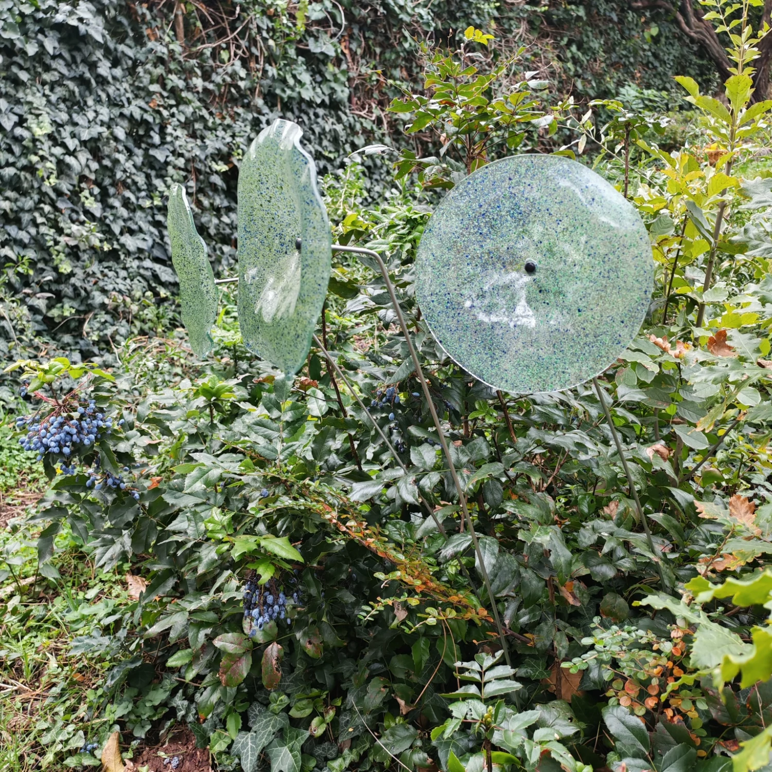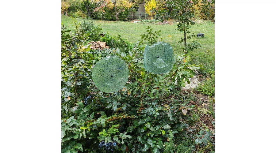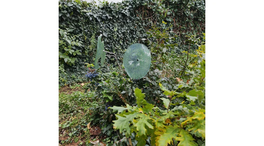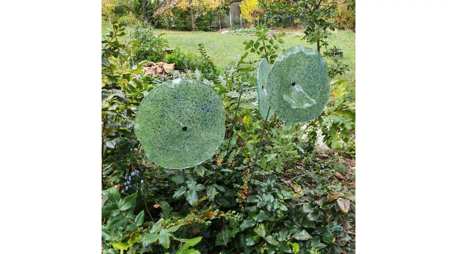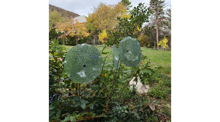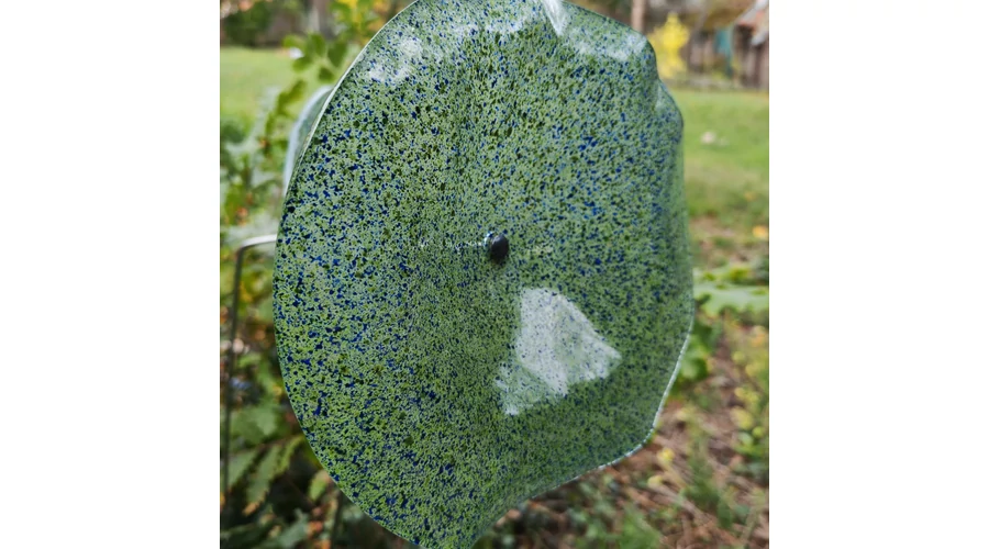 Nagy méretű 18 cm átmérőjű üveg virág kültérre transzparens- zöld-sötétkék színben 100 cm -es rozsdamentes acélszáron. Vidám és színes virágjaink télen-nyáron színesítik a kertedet vagy az erkélyedet. Harmonizálnak az élő növényekkel és virágokkal. Üvegvirág átmérője: 18 cm