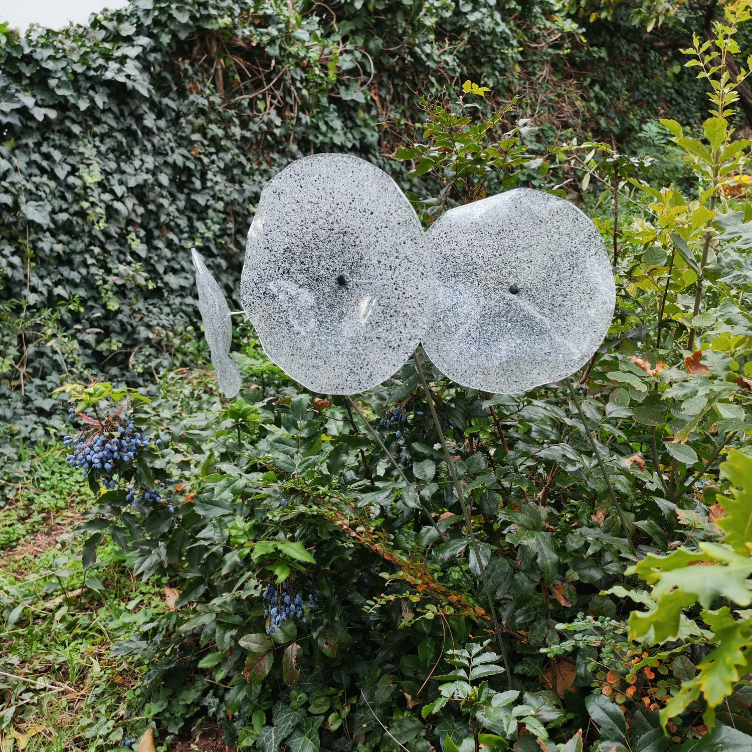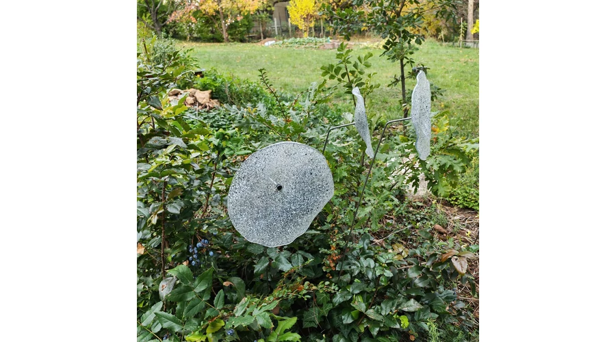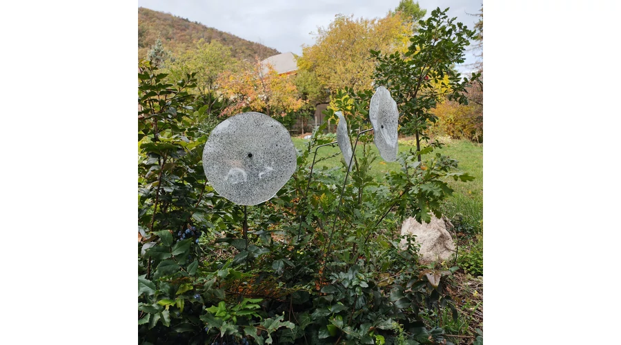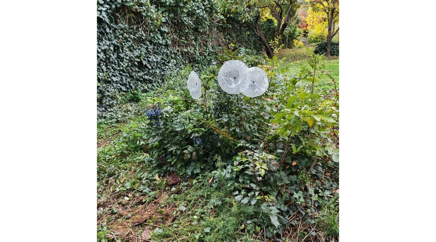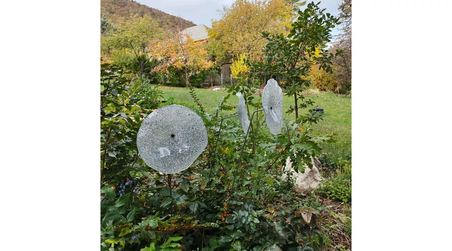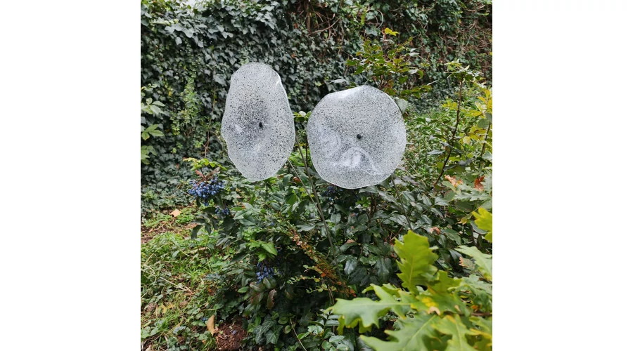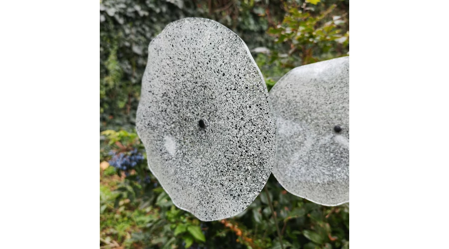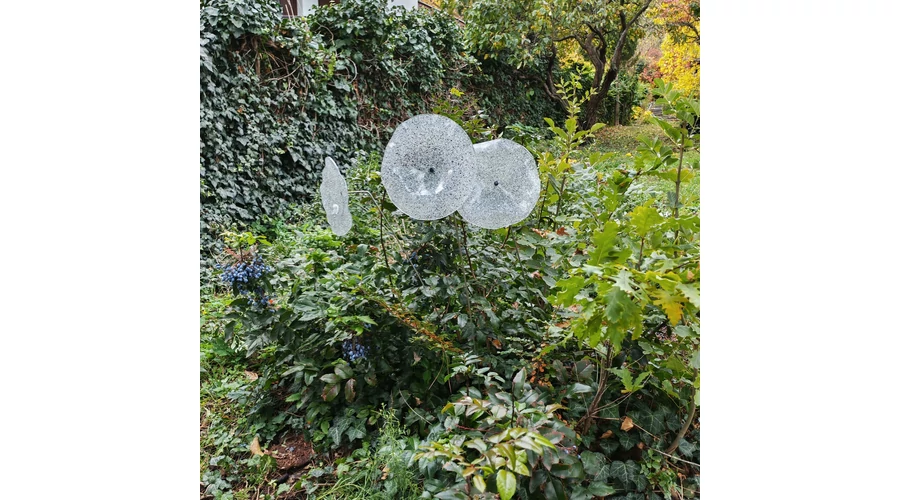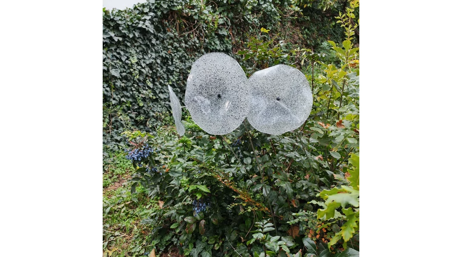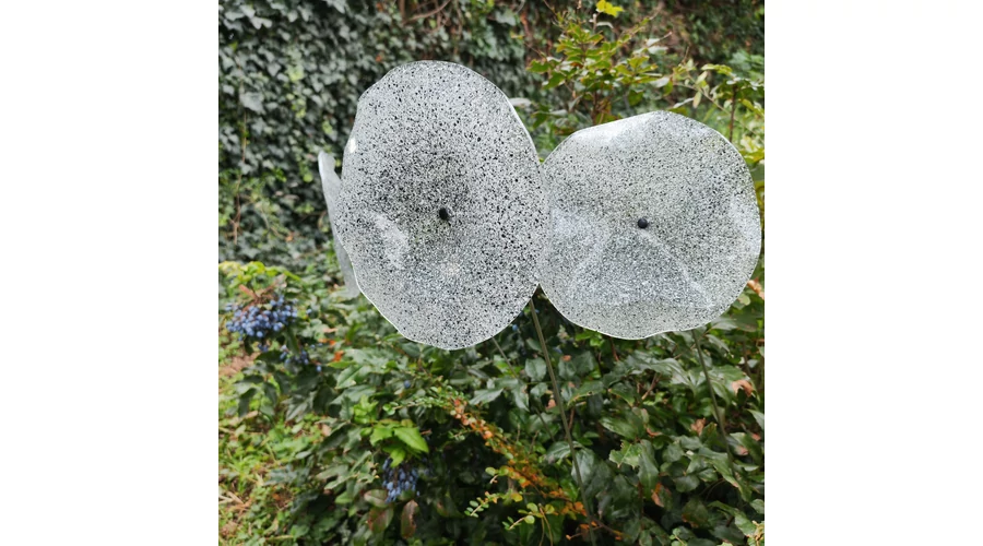 Nagy méretű 18 cm átmérőjű üveg virág kültérre transzparens- fehér-fekete színben 100 cm -es rozsdamentes acélszáron. Vidám és színes virágjaink télen-nyáron színesítik a kertedet vagy az erkélyedet. Harmonizálnak az élő növényekkel és virágokkal. Üvegvirág átmérője: 18 cm