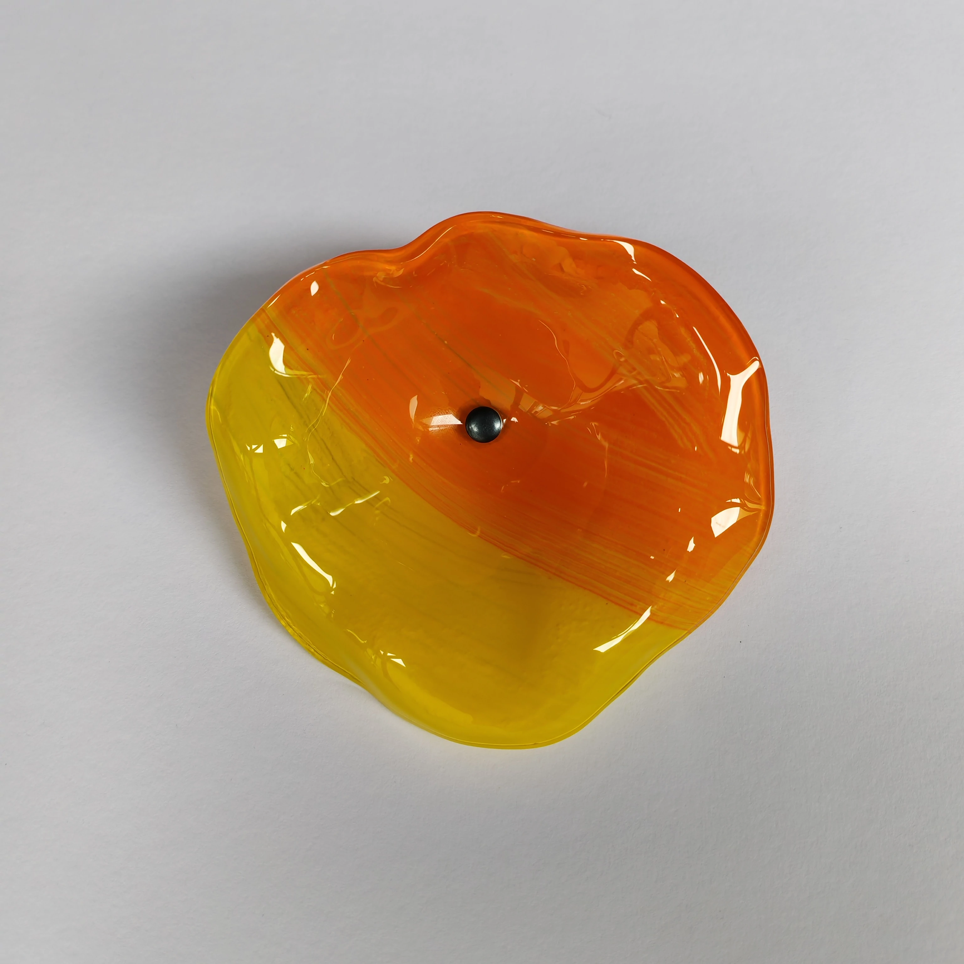 Közép méretű, sárga-narancs üveg virág (13 cm átmérőjű) 50 cm-es rozsdamentes acél száron. A spirálisan örvénylő színek vidám hangulatot teremtenek kertjében vagy erkélyén télen-nyáron. Egyedi technikával, az üvegbe égetett festéknek köszönhetően időjárás- és UV-álló.