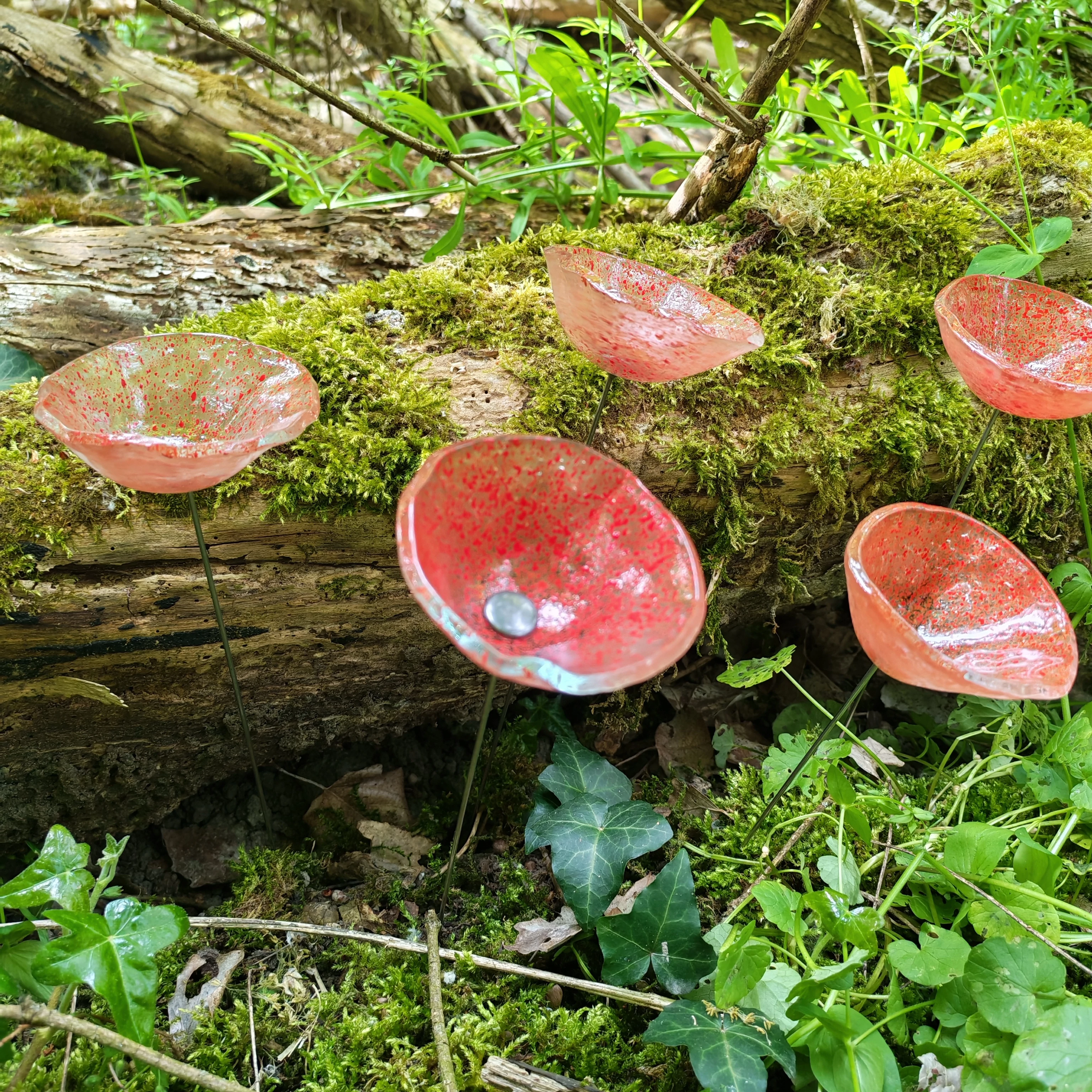 Közepes méretű üveg kála virág kültérre transzparens-piros színben 43 cm -es rozsdamentes acélszáron