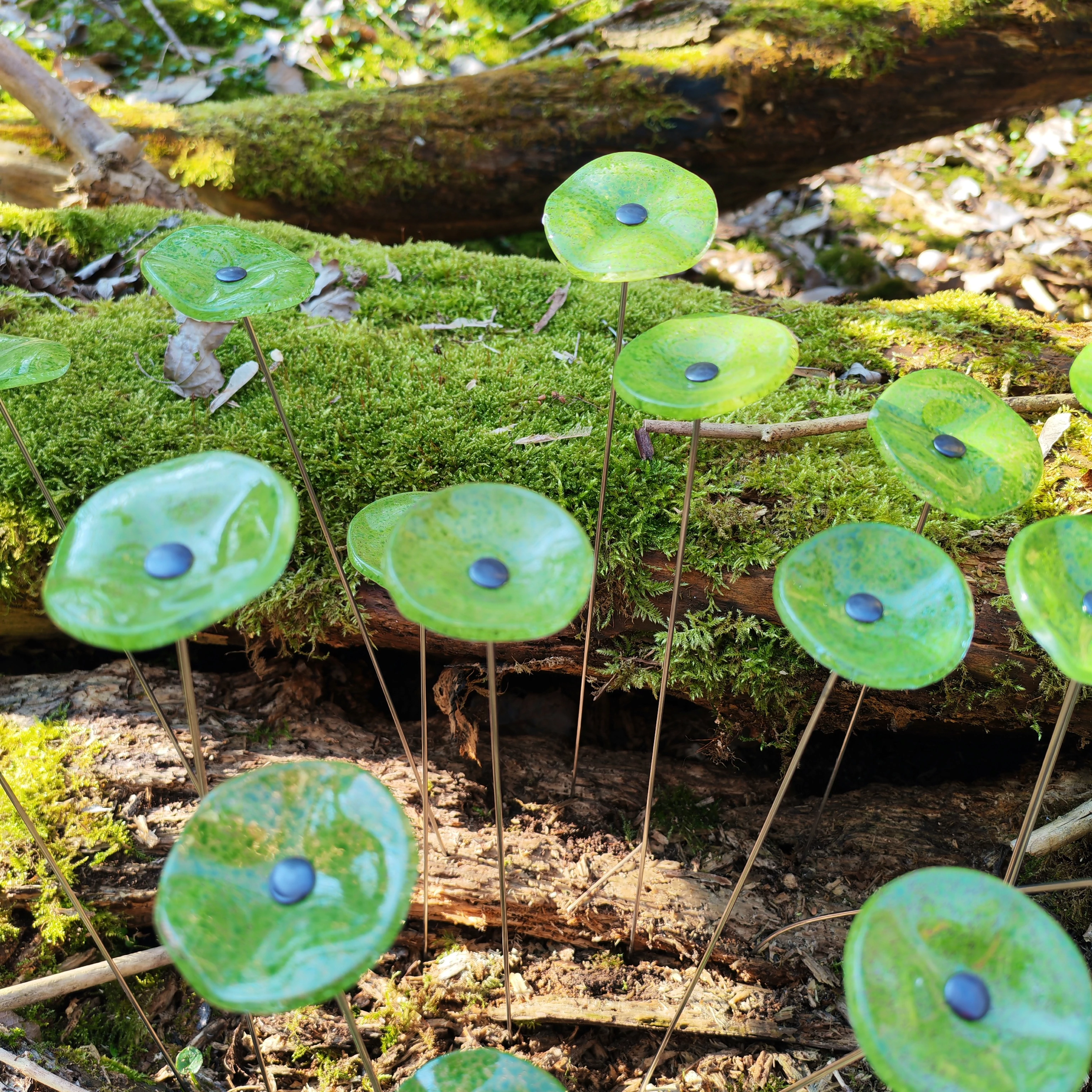 Kis méretű kerek üveg virág kültérre transzparens- almazöld színben 43 cm -es rozsdamentes acélszáron. Vidám és színes virágjaink télen-nyáron színesítik a kertedet vagy az erkélyedet. Harmonizálnak az élő növényekkel és virágokkal. Üvegvirág átmérője: 4,5 cm