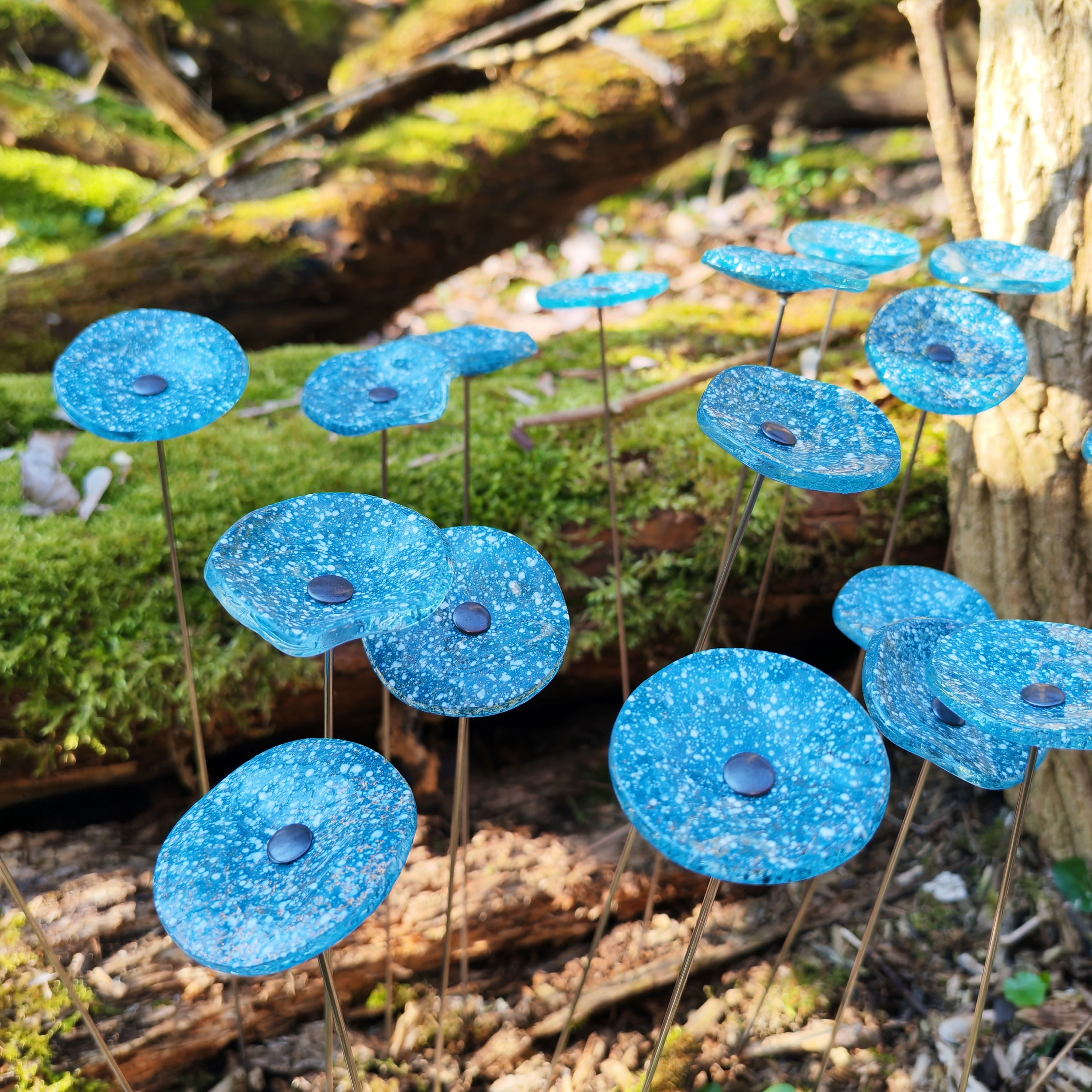 Kis méretű kerek üveg virág kültérre transzparens- türkiz-fehér színben 43 cm -es rozsdamentes acélszáron. Vidám és színes virágjaink télen-nyáron színesítik a kertedet vagy az erkélyedet. Harmonizálnak az élő növényekkel és virágokkal. Üvegvirág átmérője: 4,5 cm