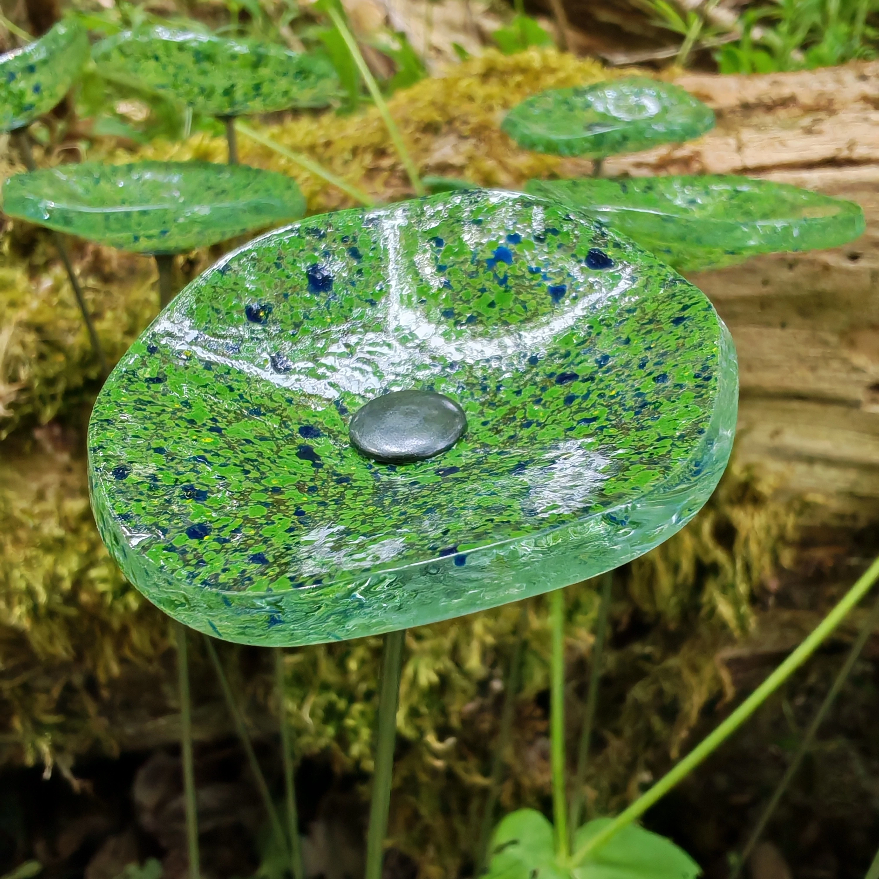 Kis méretű kerek üveg virág kültérre transzparens- zöld-sötétkék színben 43 cm -es rozsdamentes acélszáron. Vidám és színes virágjaink télen-nyáron színesítik a kertedet vagy az erkélyedet. Harmonizálnak az élő növényekkel és virágokkal. Üvegvirág átmérője: 4,5 cm