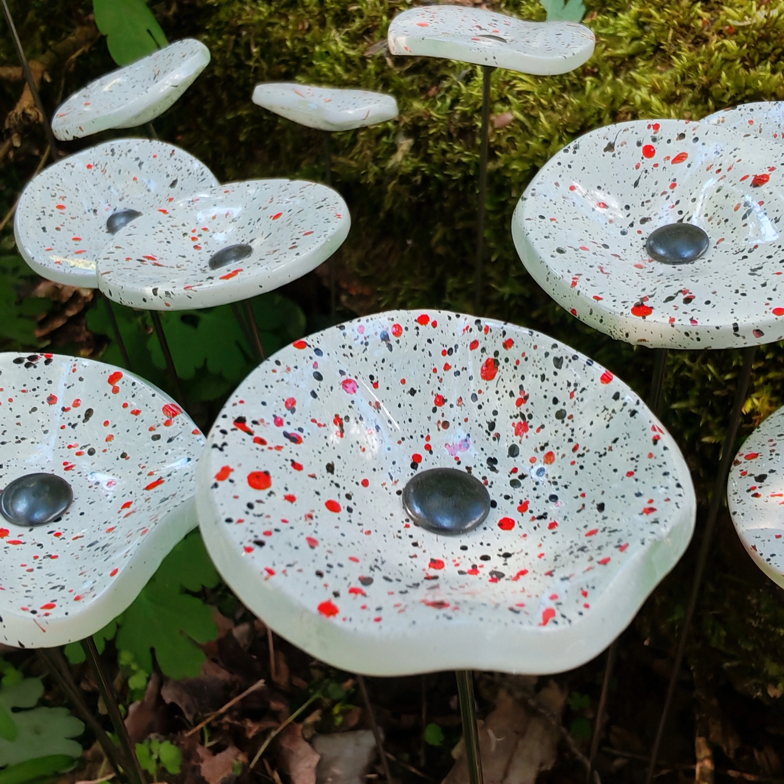 Kis méretű kerek üveg virág kültérre fehér- piros-fekete színben 43 cm -es rozsdamentes acélszáron. Vidám és színes virágjaink télen-nyáron színesítik a kertedet vagy az erkélyedet. Harmonizálnak az élő növényekkel és virágokkal. Üvegvirág átmérője: 4,5 cm
