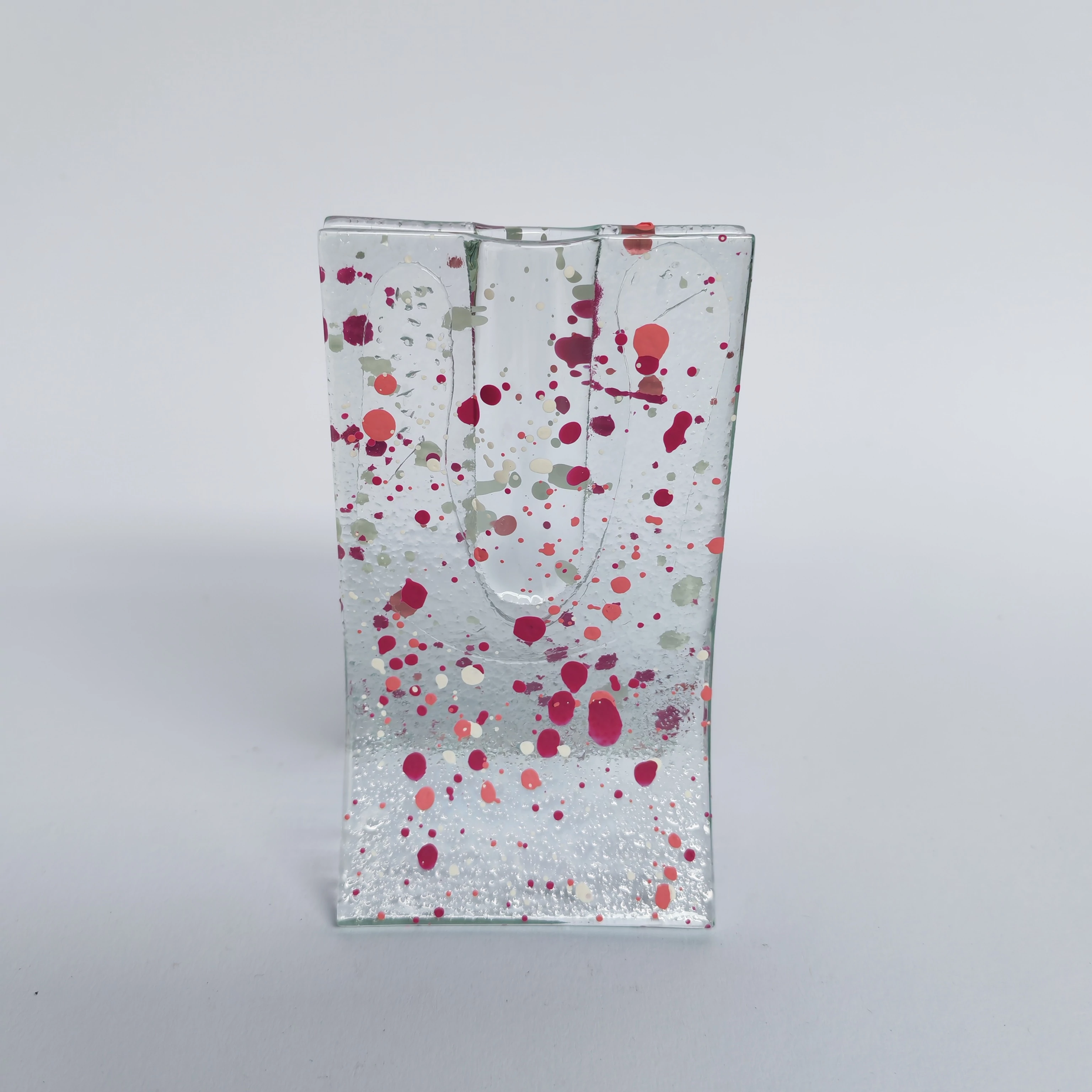 Transzparens alapú fuscia-rózsaszín-fehér pöttyös mintájú kis váza 8x13 cm-es méretben.