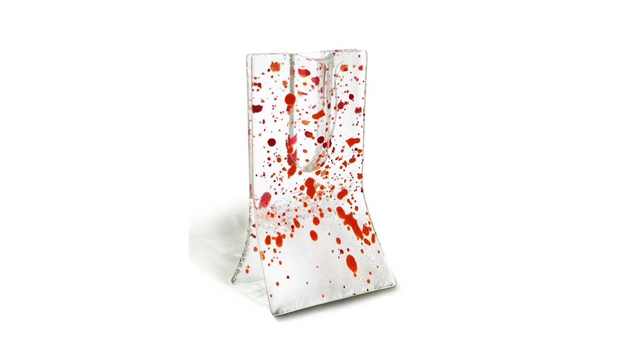 Transzparens alapú piros-narancs pöttyös mintájú kis váza 8x13 cm-es méretben.