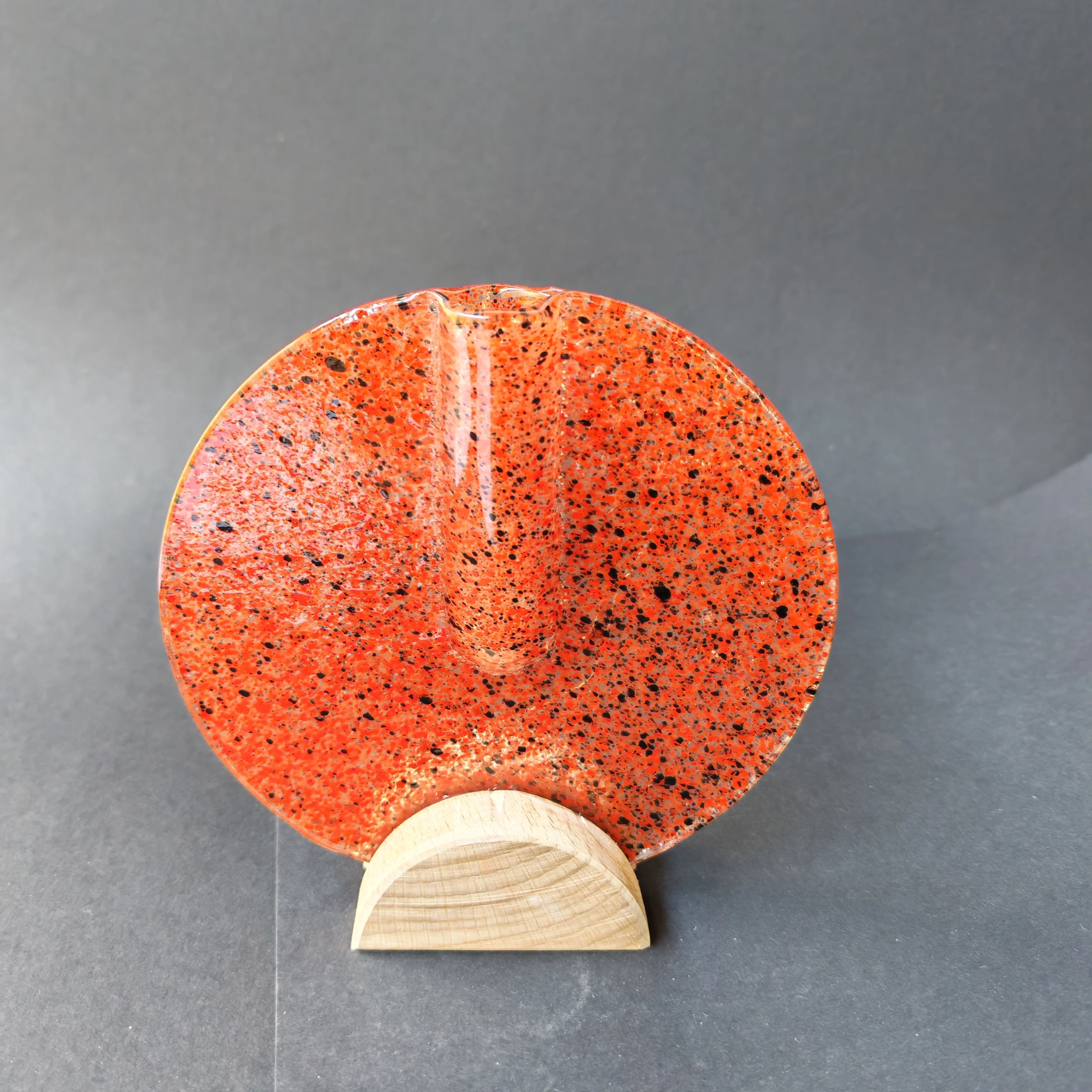 Kis kerek váza bükkfa talppal, 13 cm - átlátszó piros-fekete
