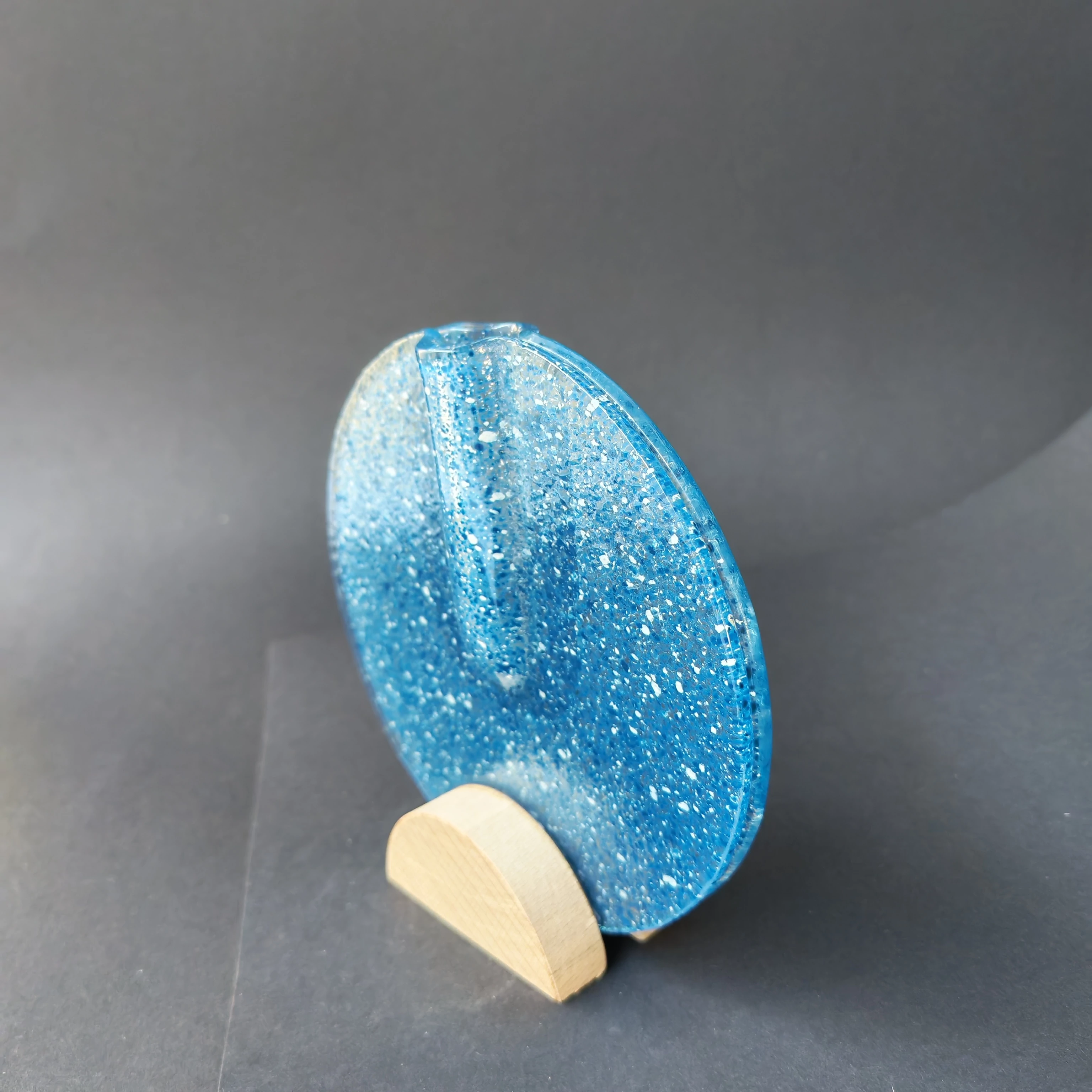 Mutassa be virágait ebben a kicsi, tökéletesen kerek vázában, tömör bükkfa talppal. Az üveg élénk színe azonnal feldob bármilyen teret, kiemelve annak letisztult, egyedi formáját.