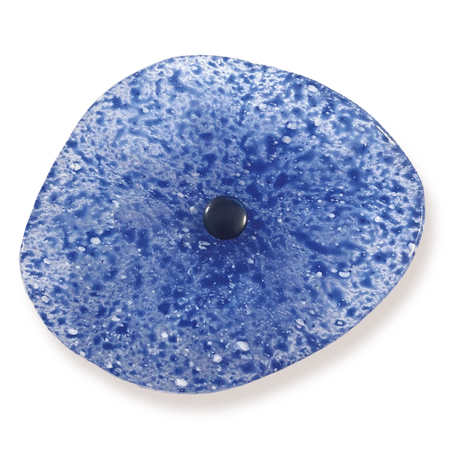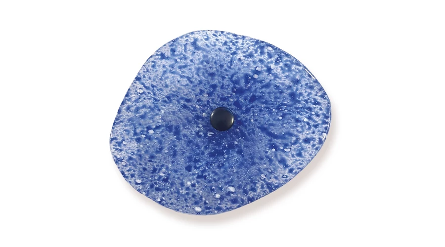 Világos és sötétkék pöttyök nyugtató keveréke átlátszó üvegen. Az egyedi szoborszerű forma az olvasztott üveg technikájának eredménye, praktikus kialakítása pedig kiváló UV-, víz- és időjárásállóságot biztosít a kültéri tartósság érdekében.
