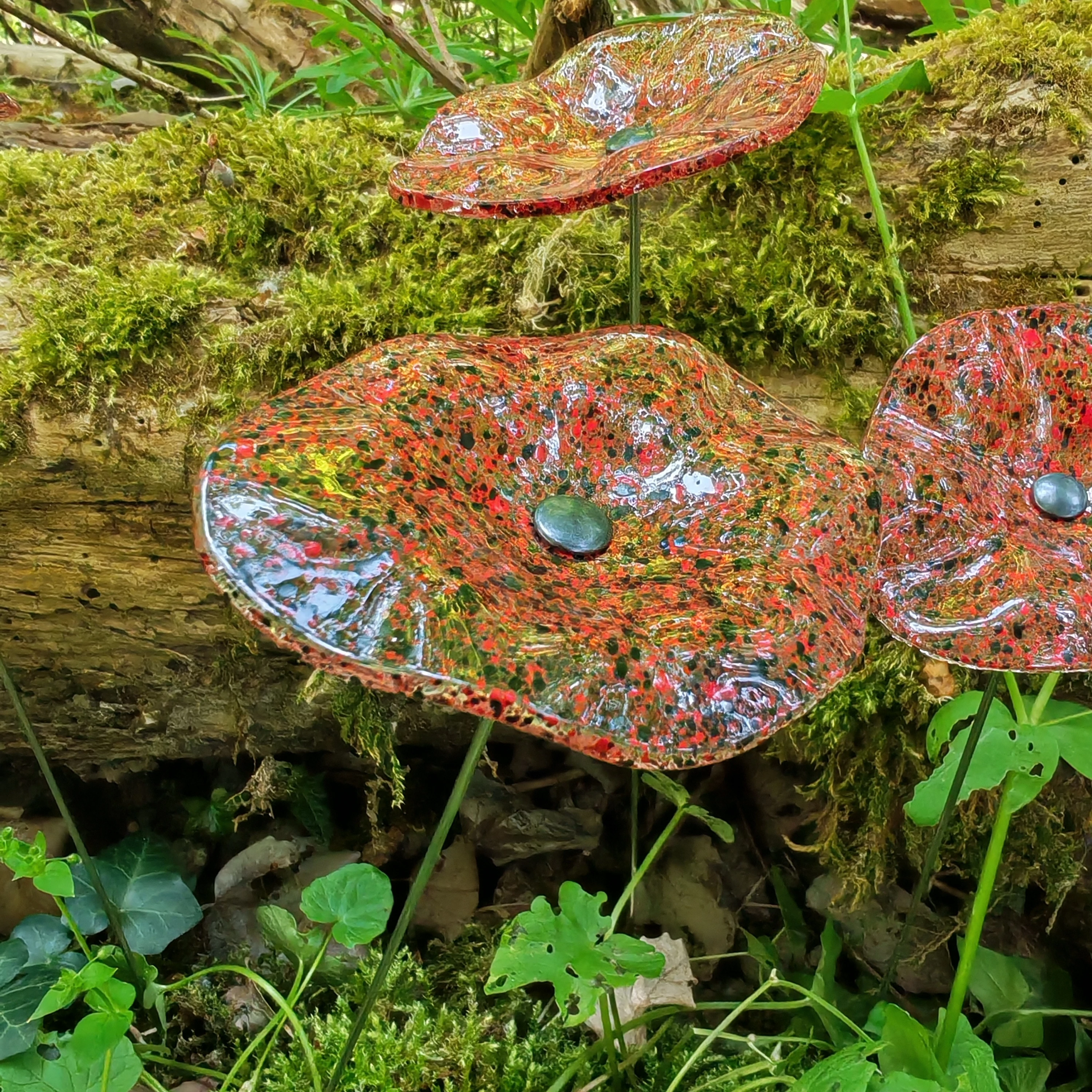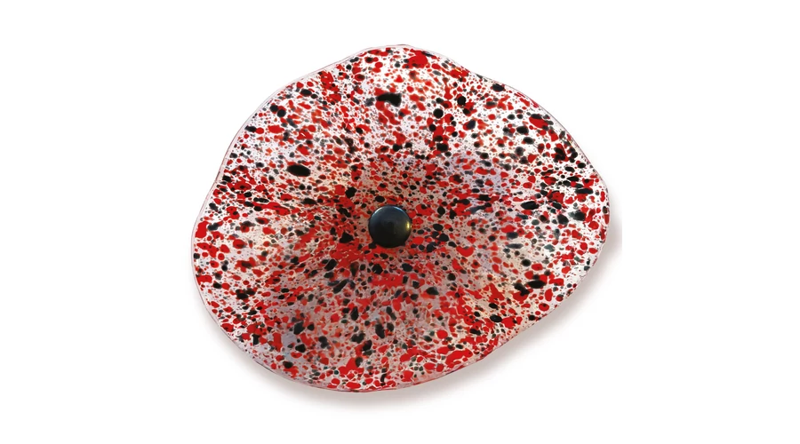 Szembetűnő piros és fekete pöttyök átlátszó üvegen. Ez a darab az olvasztott üveg technikával elérhető jellegzetes formákat mutatja be, színeit pedig erős UV-, víz- és időjárásállóság védi a tartós kültéri használat érdekében.