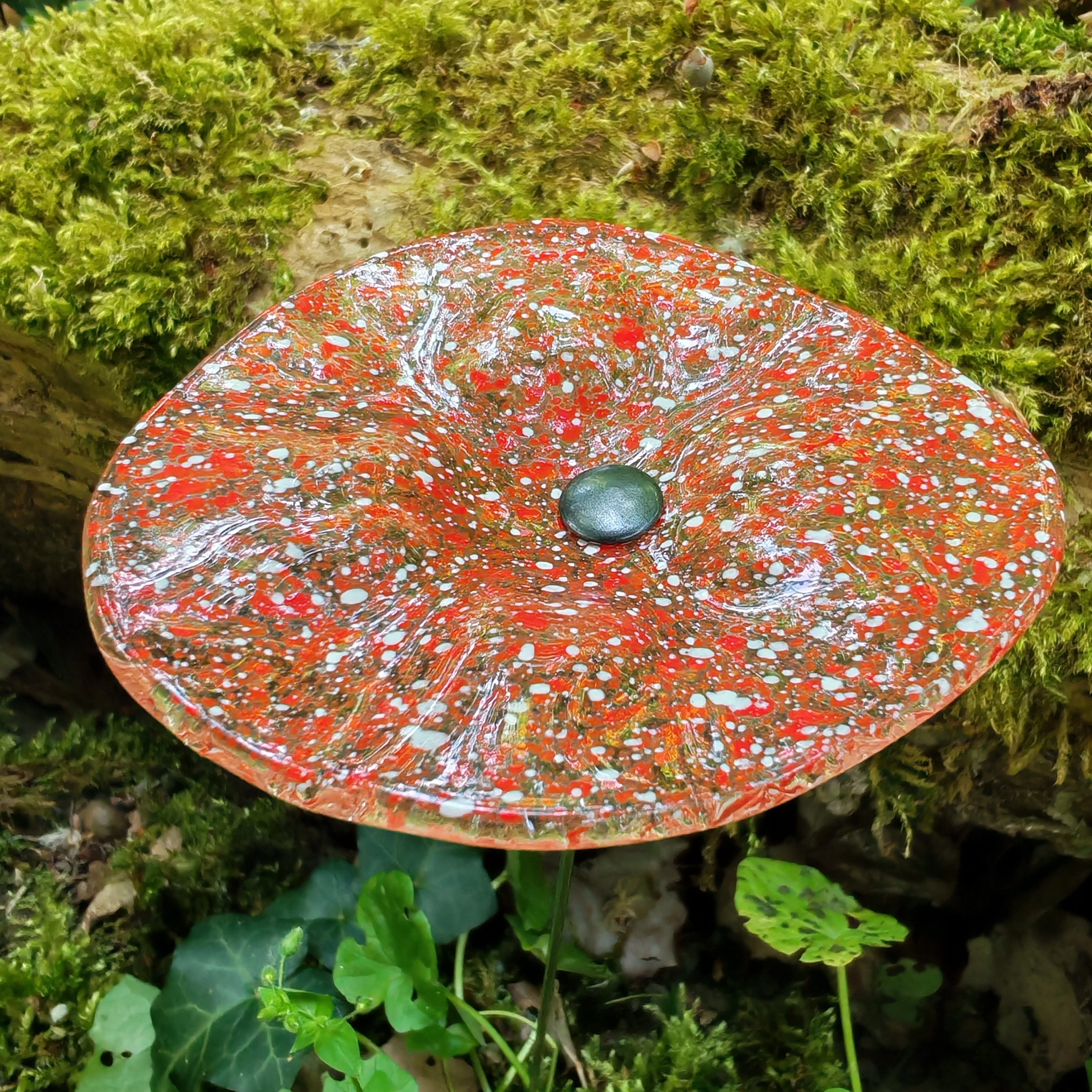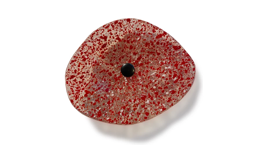 Ez az átlátszó ovális üvegvirág piros és fehér pöttyökkel van tele. Egyedi formája az olvasztott üveg technika védjegye, kültéri tartósságát pedig a robusztus UV-, víz- és időjárásállóság biztosítja.