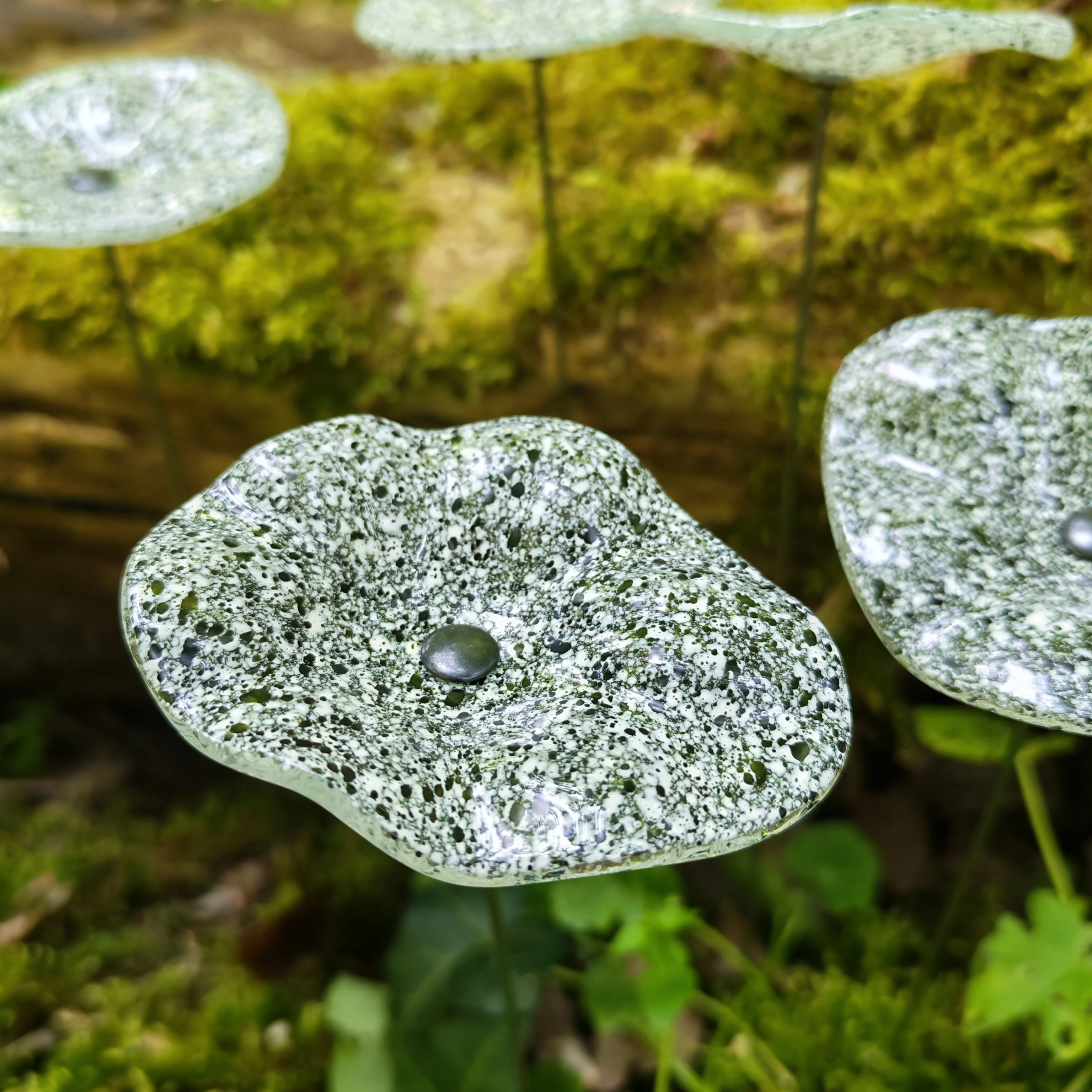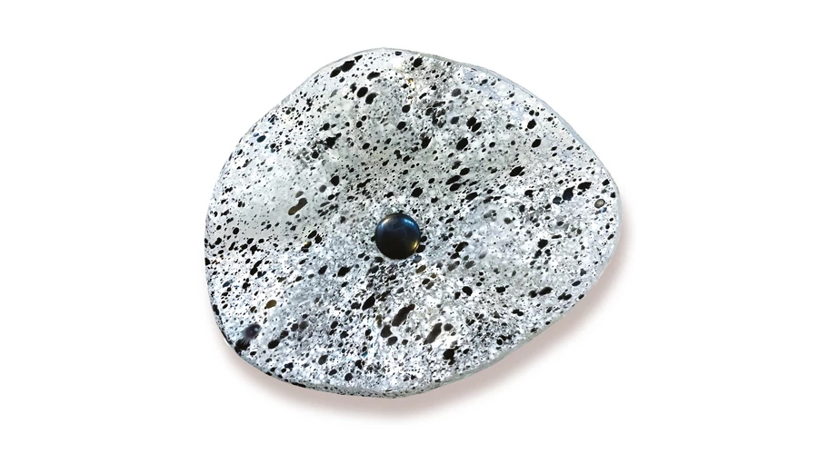 Klasszikus kontraszt átlátszó üvegen: fehér és fekete pöttyök határozzák meg ennek az ovális virágnak a különleges formáját, amelyet az olvasztott üveg technika biztosít. Ez a virág kültéri használatra készült, garantáltan UV-, víz- és időjárásálló.