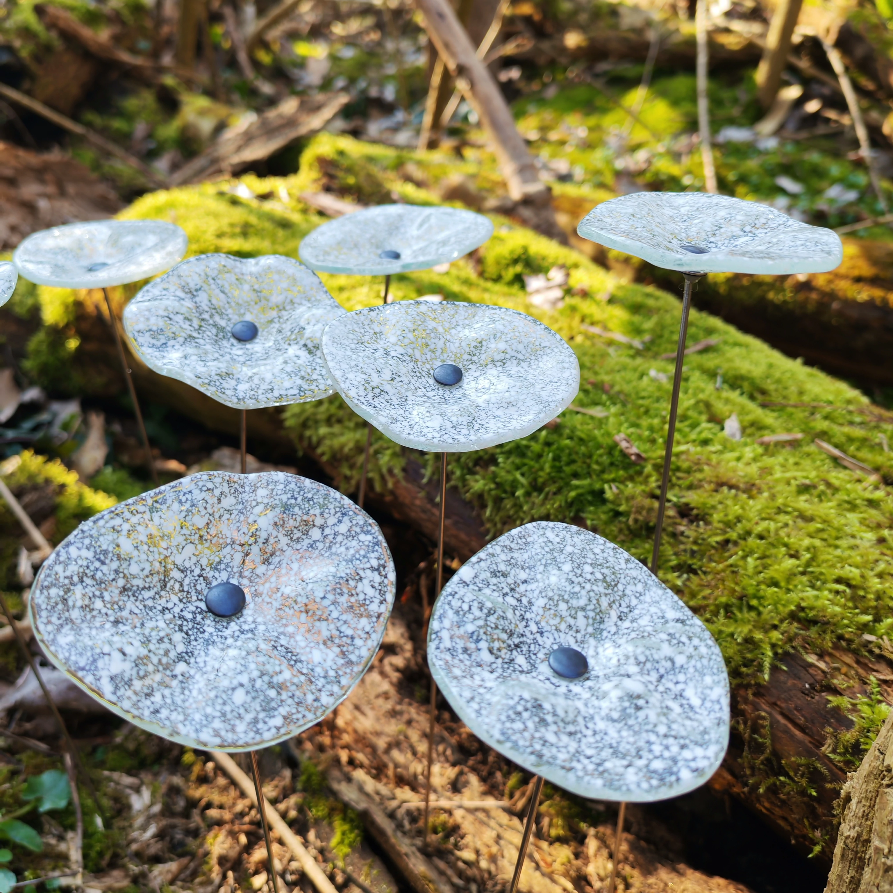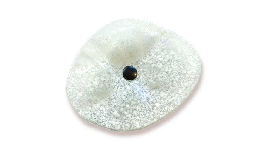 Kristálytiszta üveg, elegáns fehér pöttyökkel kiemelve, egyedi formázású, olvasztott üveg technikával. Gyönyörű és tartós kerti kiegészítő, ez a darab erős UV-, víz- és időjárásállósággal rendelkezik a tartós tisztaság és ragyogás érdekében.