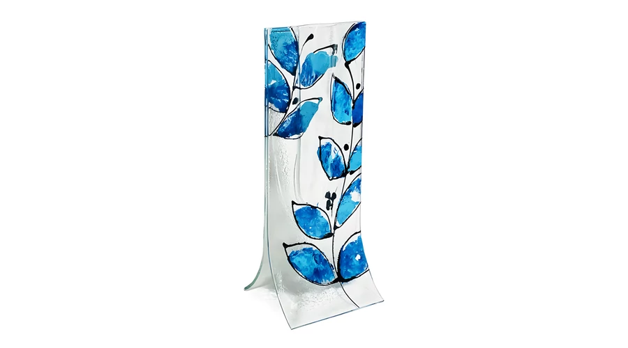 Transzparens alapú sötétkék-világoskék leveles váza 14x36 cm-es méretben A váza alkalmas mind az üvegvirágok, mind élő virágok tárolására.