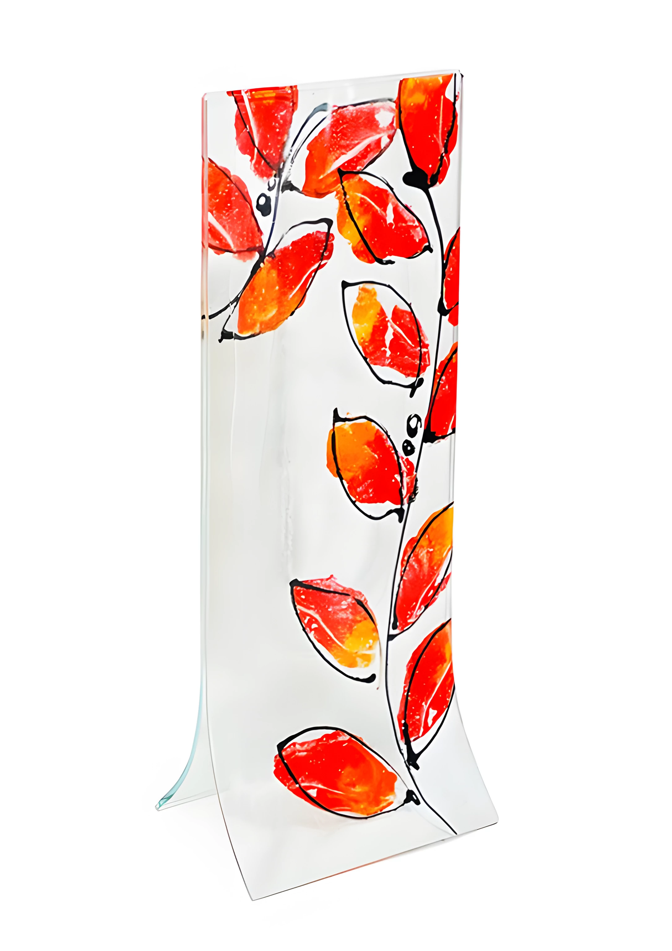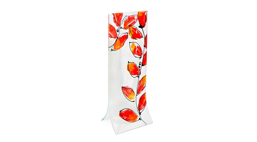 Transzparens alapú piros-narancs leveles váza 14x36 cm-es méretben A váza alkalmas mind az üvegvirágok, mind élő virágok tárolására.
