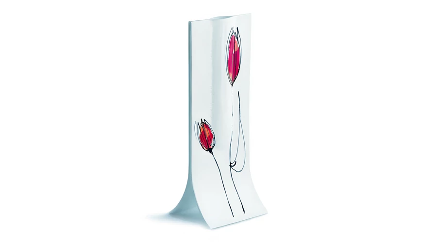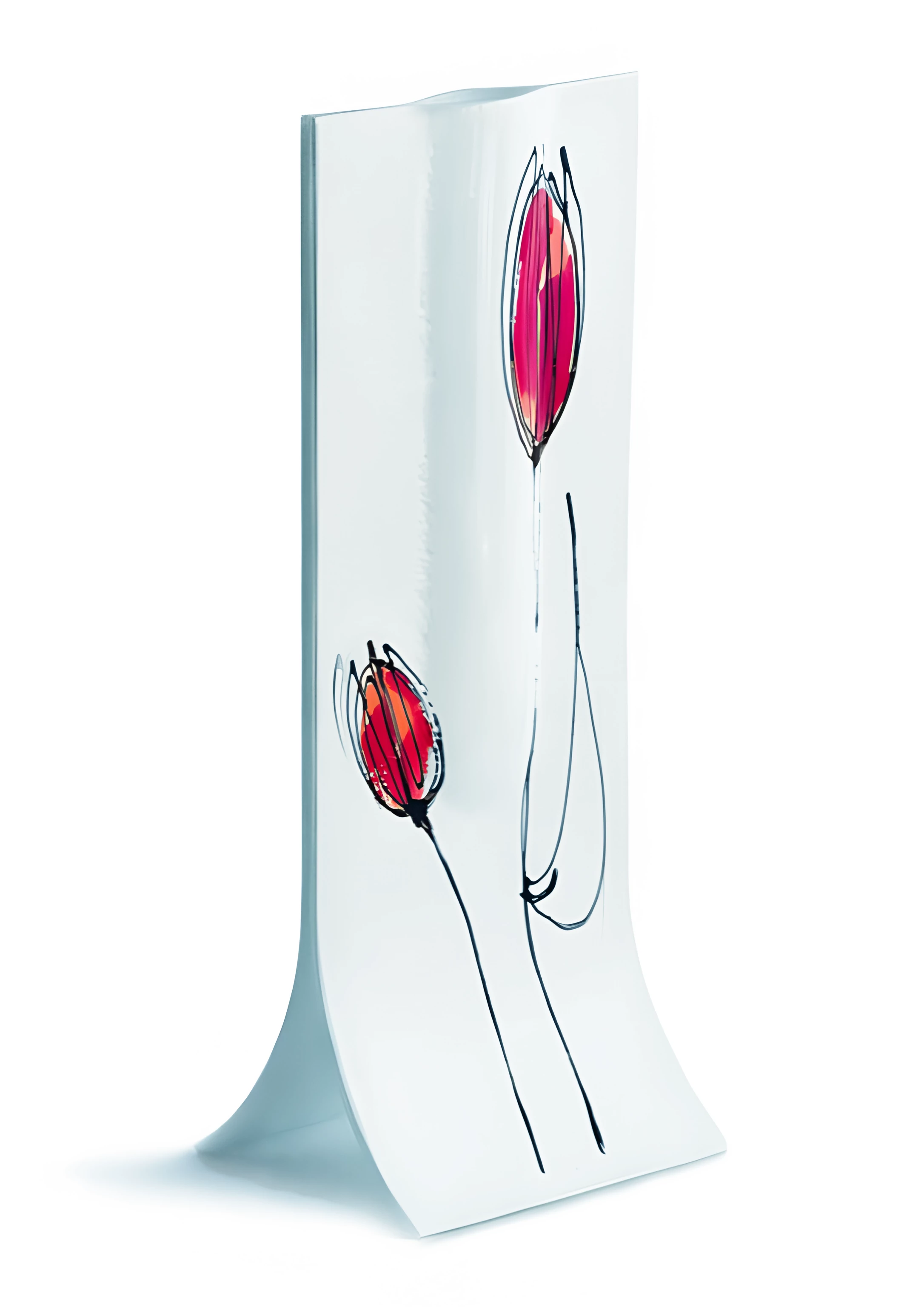 Fehér alapú encián-pink-tulipános váza14x36 cm-es méretben. A váza alkalmas mind az üvegvirágok, mind élő virágok tárolására.
