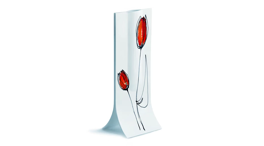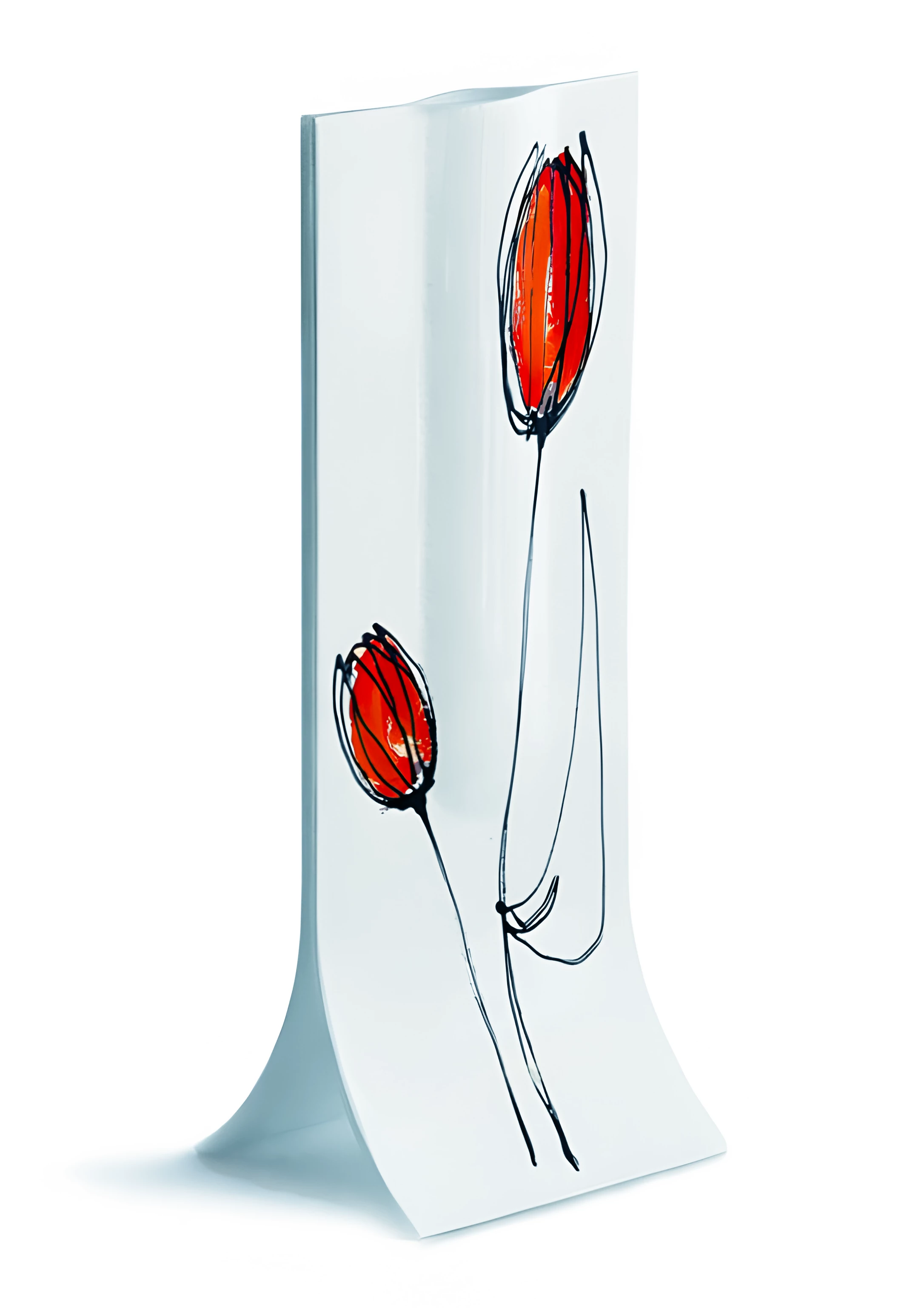 Fehér alapú piros tulipános váza 14x36 cm-es méretben. A váza alkalmas mind az üvegvirágok, mind élő virágok tárolására.