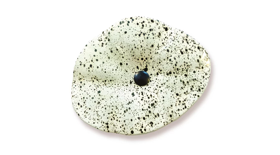 Fehér alapszínű ovális üvegvirág, fekete pöttyökkel