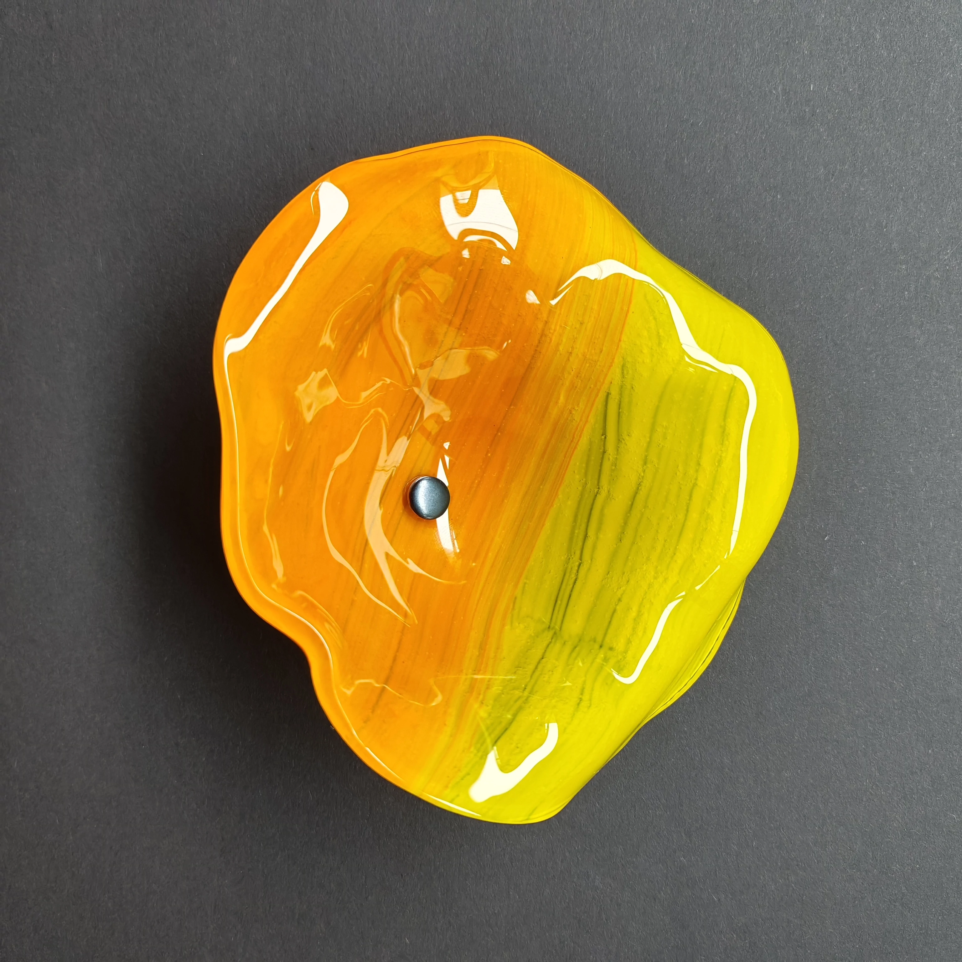 Vidám, 50 cm magas, vörös-narancssárga üveg virág kültéri használatra. A 13 cm átmérőjű, spirálisan örvénylő színekkel díszített üvegvirág egyedi technikával készült: a festék be van égetve az üvegbe, így időjárás- és UV-álló. Télen-nyáron feldobja kertjét vagy balkonját! Rozsdamenetes acél szárral.